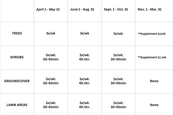 We recommend that your plants receive water specific to each season for the first 2-3 years after planting. Water 30-45 minutes as follows to thoroughly soak the roots of your new plants. If it rains, reduce your watering by the amount of natural rainfall received.